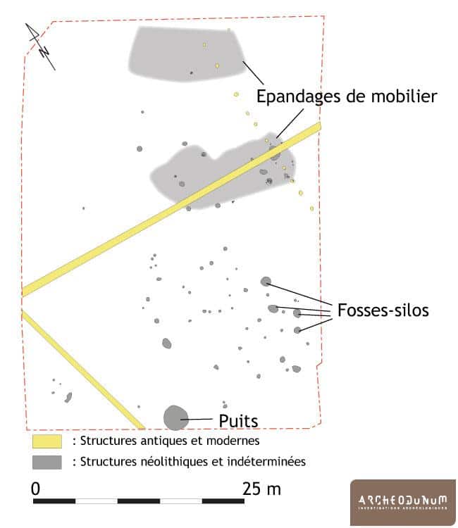 Quelques fosses silos pourraient se raccorder à la phase moyenne du Néolithique, mais elles n’ont livré que peu de mobilier et une seule datation est comprise à la fin du Néolithique moyen, entre 3600 et 3400 avant notre ère.
