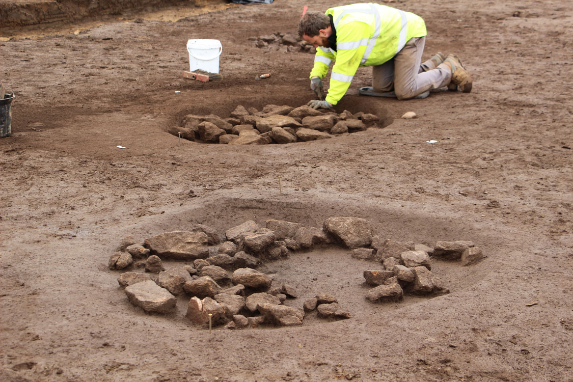 Une vingtaine de foyers à pierres chauffées fonctionnent vraisemblablement sur le même laps de temps ; le lien semble d’ailleurs parfois étroit entre foyers et calages de stèle.