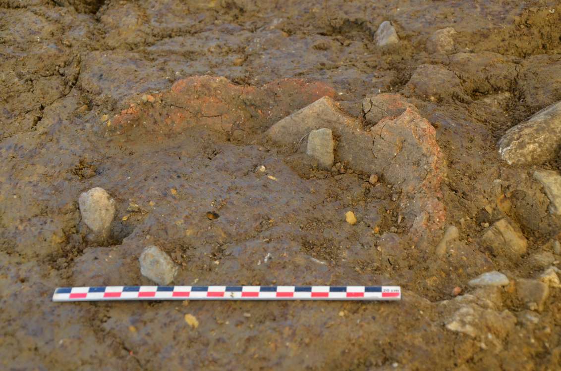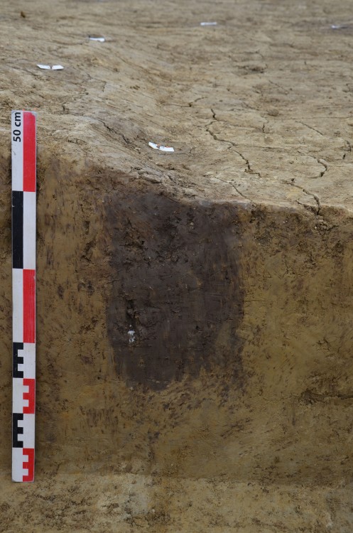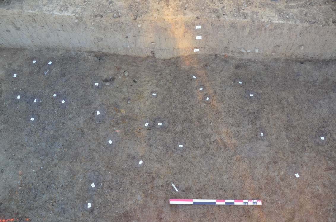Cette occupation est principalement matérialisée par des trous de poteaux et des fosses, ainsi que par des fossés drainants postérieurs. Les structures en creux témoignent de la présence d’édifices en matériaux périssables, probablement réaménagés et reconstruits au fil du temps. Le contexte érosif du site et la concentration importante des vestiges rendent l’organisation spatiale difficile à restituer. Faute d’un mobilier abondant et précisément daté, ce sont les résultats d’analyses radiocarbones qui livrent l’essentiel des informations chronologiques. Elles déterminent une large période d’occupation pré- et protohistorique comprise entre le 6e et le 1er millénaire av. notre ère, avec comme étapes principales, le Néolithique moyen I/II et le Néolithique récent. Deux pièces issues de l’industrie lithique (trapèze et outil sur lame) font même remonter la première fréquentation du secteur au Mésolithique récent, période également identifiée par une analyse radiométrique. Le décapage mécanisé du paléosol, réalisé avec un carroyage en « UD », n’a livré qu’une quantité infime de mobilier céramique en mauvais état de conservation. Ce matériel ne permet pas de caractériser les activités en lien avec cette occupation, mais il livre tout de même des marqueurs du Néolithique et de l’âge du Bronze.