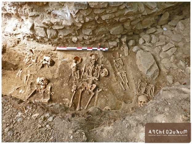 Enfin, 43 sépultures ont été mises au jour. Toutes sont primaires et simples à l’exception d’une tombe occupée par deux individus immatures. Les ossements sont majoritairement bien conservés mais un fort taux de recoupement est à noter, ce qui va altérer les observations réalisables. La fouille n’ayant été faite que sur un espace très restreint, les conclusions portant sur le recrutement ou la répartition des individus ne pourront être faites, dans un souci de pertinence.