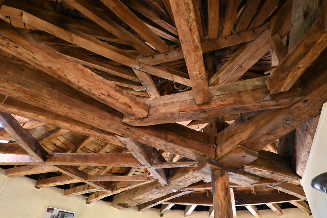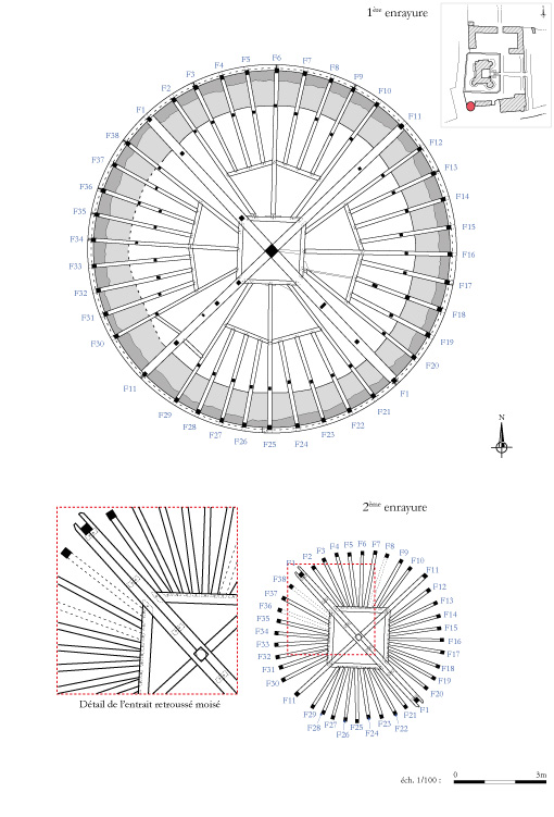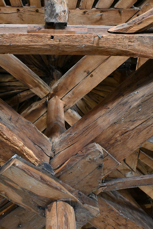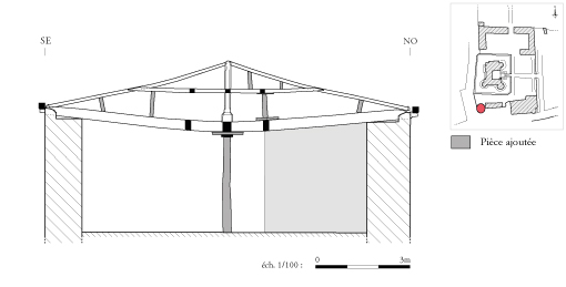 Cette opération a consisté en l'étude de la charpente et des planchers de l'actuelle tour d'accueil du château. L'étude des structures en bois de cette tour a permis de mettre en évidence la plus ancienne structure charpentée connue du site de Saint-Marcel-de-Félines. En effet, le plancher de la cave daté de 1327-1328d (pour l'abattage de ses bois) est plus ancien que la galerie en bois de la Maison Sivart (1401-1402d) ou de l'oratoire (1413-1414d). Malheureusement, sans étude archéologique approfondie, il est impossible de savoir s'il s'agit d'un réemploi ou d'une pièce en position initiale. Concernant la charpente de toit de la tour d'accueil, il est facile de voir que sa conception présente quelques erreurs. Effectivement, la présence d'un poteau de soutènement placé sous la croisée des deux entraits principaux ait dû à un fort fléchissement de la charpente en son centre. Ce fléchissement est très marqué puisque l'entrait principal s'est affaissé et a entrainé l'ensemble de la structure. Au total, 47 jambettes ont été rajoutées à de multiples endroits et sur les deux niveaux d'enrayures. Le fléchissement de la charpente s'explique par l'utilisation de bois de chêne de grande longueur et de très forte section. De plus, la très faible pente de toiture mise en œuvre (18°) implique une forte pression au niveau du poinçon qui perçoit toutes les charges au lieu de travailler en traction, en tirant l'entrait vers le haut. Normalement, le poinçon permet de répartir les charges sur les chevrons qui peuvent ainsi transférer la charge sur les maçonneries. Cependant, ce problème de statique a dû être envisagé dès la conception de la charpente puisqu'un entrait retroussé moisé a été mis en œuvre sur la ferme F1. Ce système permet à l'entrait retroussé de reprendre les efforts de traction assurés normalement par l'entrait. D'après C. Alix et J. Noblet, ce procédé est attesté dès le XIIe siècle et courant dans les maison orléanaises dès le XVe-XVIe siècle. En Franche-Comté, C. Perrault a lui aussi mis en évidence plusieurs charpentes dans lesquelles des entraits retroussés moisés sont utilisés. C. Alix et J. Noblet mettent en évidence que lorsque les deux pièces de bois composant l'entrait retroussé moisé sont positionnées à plat, elles ne travaillent pas de la bonne manière. Au contraire, elles "soumettent les éléments d'assemblages à un effort important et présentent un risque de fléchissement". Pour pallier ce fléchissement, au XVIIIe-XIXe siècle, les moises vont être tournées de 90° et donc posées de chant. Ainsi, les pièces ont une plus forte résistance. On remarque que pour la charpente de Saint-Marcel-de-Félines, réalisée à la fin du XVIe siècle, les pièces sont effectivement positionnées à plat et non de chant. Ainsi, avec la faible pente de toiture, le faux entrait retroussé moisé n'a pas réussi à tenir son rôle et l'ensemble de la charpente a fortement fléchi. La mise en place d'un poteau sous le poinçon et de nombreuses jambettes ont permis de maintenir la structure en place jusqu'à aujourd'hui.