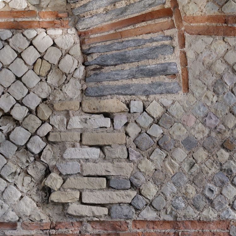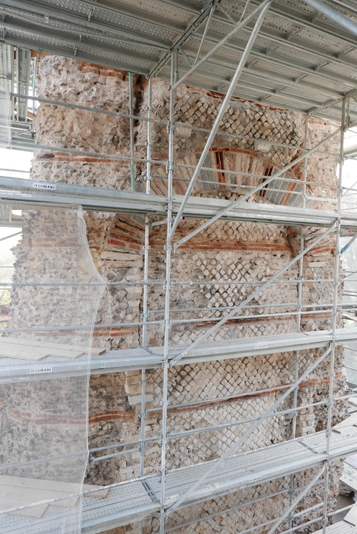 La progression et les étapes du chantier apparaissent au travers d’une multitude d’indices telles que les planées, les collages de mortier, les micro-variations de la nature des mortiers ou avec la diversité de certains matériaux comme les briques.