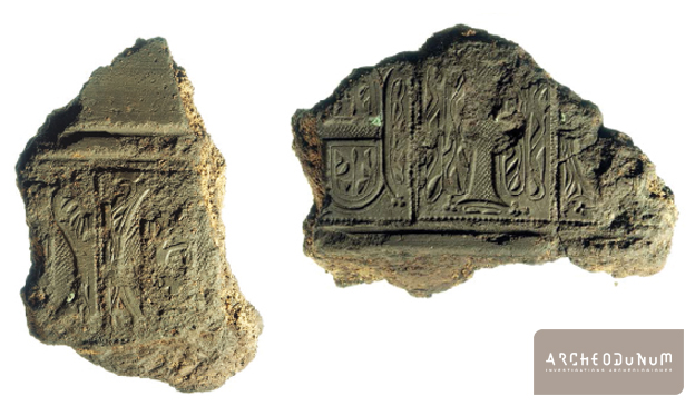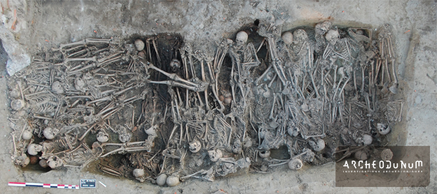 Phase 4 : artisanat et cimetière de crise La phase 4 correspond à la principale phase d’occupation du site, tant par la densité que par la nature des vestiges. Dans un premier temps, durant la phase 4a, le nord du site est occupé par deux ensembles, l’un à sol excavé et le second sur poteaux porteurs, probablement en lien avec une activité artisanale. Ces ensembles sont détruits et abandonnés à la fi n du XIIIe siècle. Durant le XIVe siècle, phase 2b, d’autres ensembles à vocation artisanale s’implantent sur le site. Certains sont en lien avec le traitement de carcasses équines, d’autres avec la tabletterie et enfin le dernier ensemble est lié à la métallurgie du bronze et plus particulièrement la fonte de cloches. Cette occupation artisanale est contemporaine du cimetière de crise mis au jour dans la partie méridionale du site. Ce cimetière se caractérise par la présence de 109 sépultures dont 80 sépultures simples et 29 sépultures plurielles (doubles, triples et quadruples) dont trois charniers. Ces sépultures renfermaient 452 individus (incluant les individus mis au jour durant le diagnostic) dont 311 inhumés dans les trois charniers. De nombreux éléments nous permettent d’attribuer la plupart de ces sépultures à l’épisode de peste ayant touché l’Europe occidentale à partir de 1347. La présence dans certaines sépultures d’émissions monétaire datant de 1347-1348, l’identification du bacille de la peste et plusieurs 14C indiquent clairement le lien existant entre ces sépultures, qu’elles soient individuelles ou plurielles, et la pandémie du XIVe siècle.