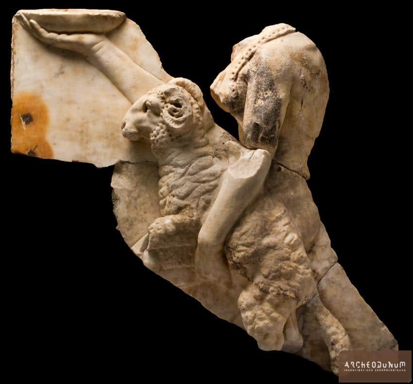 Le premier correspond à des éléments d’habillage du théâtre : fûts et tambours de colonnes, plaquages de marbre, éléments du pulpitum, fragments de bas-relief, éléments de tuyauterie, etc. Cependant certaines pièces, comme une inscription (ex voto), évoquent une origine différente. Il semble ainsi que des éléments appartenant à d’autres monuments périphériques ont été rapportés dans l’enceinte du théâtre : ces pierres étaient probablement destinées à alimenter les fours à chaux attestés dans le secteur. En effet, les principaux monuments publics du Haut-Empire (Ier-IIIe s. apr. J.-C.) ont fait l’objet de démontages pour alimenter les nouvelles constructions de l’Antiquité Tardive. Le second ensemble correspond plutôt à un dépotoir domestique caractérisé par une grande variété de mobiliers : vaisselles en céramique, en verre et métal, amphores, objets divers, monnaies, faune et restes de construction (tuiles, briques, tubuli, etc).