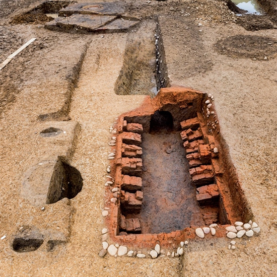 Le principal vestige de l’occupation médiévale est un important four de tuilier du début du XIIIe s. bénéficiant d’un bon état de conservation. Il se présente sous forme d’un four quadrangulaire de 4,30 x 2,50 m, excavé et parementé d’adobe lié à l’argile, accompagné d’une fosse de travail excavée. Les deux fosses sont reliées par un alandier voûté, creusé en sape dans le terrain naturel. Les piles partiellement conservées et les briques issues de l’effondrement du four permettent de restituer une sole en briques alternées. La production du four, dont témoignent de nombreux ratés de cuisson, est constituée de tuiles canal. Aucune autre structure de l’atelier de tuiliers de Villars n’a pu être mise en évidence dans l’emprise de fouille. Le four lui-même connaît un usage limité dans le temps, avant d’être abandonné et de voir sa fosse de travail partiellement recreusée pour servir de mare.
