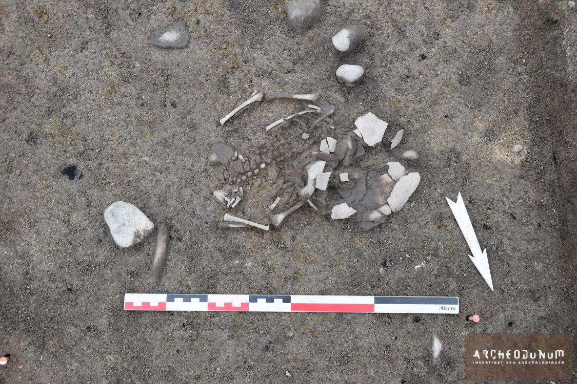 La tombe en inhumation d’un jeune enfant a été mise au jour dans cet habitat, à proximité immédiate d’un seuil. L’étude taphonomique indique que le jeune défunt était un périnatal inhumé en espace vide.