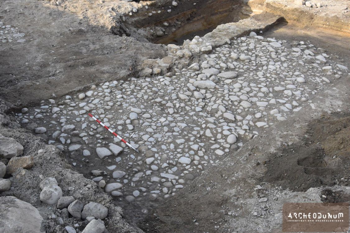 Les premières traces de fréquentation du site, datées par de rares éléments de mobilier et quelques analyses au radiocarbones remontent à La Tène finale. Il s’agit d’un large empierrement linéaire, suivant une orientation nord-ouest / sud-est, mis en place dans le lit d’un ancien chenal peu profond. Il est délimité au nord par un mur de soutènement fait de pierres sèches, sans ossature de bois. Les rares trous de poteaux et autres traces de labours repérées dans une coupe stratigraphique témoignent d’une occupation liée à la circulation et peut-être à des activités agro-pastorales, dans un secteur qui reste tributaire, à ce moment-là, des transgressions du lac.