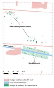 Les vestiges les plus récents appartiennent à des parties démantelées de l’arsenal militaire, installé et développé à partir de 1917. Il s’agit de notamment de plateformes bétonnées au nord de l’emprise, ultimes traces des parties communes des baraquements des ouvriers travaillant pour l’arsenal. 2000 ans auparavant, c’est un fossé parcellaire de l’époque romaine qui traverse le sud de l’emprise.