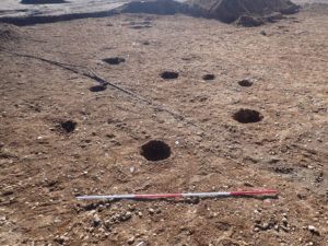 Dans l’angle nord-ouest, une autre concentration de structure a été retrouvée lors de notre fouille. Il s’agit là encore de trous de poteau, qui semblent notamment dessiner une petite structure circulaire de 3 à 4 m de diamètre. À proximité, un vase enterré devait servir de récipient de stockage.