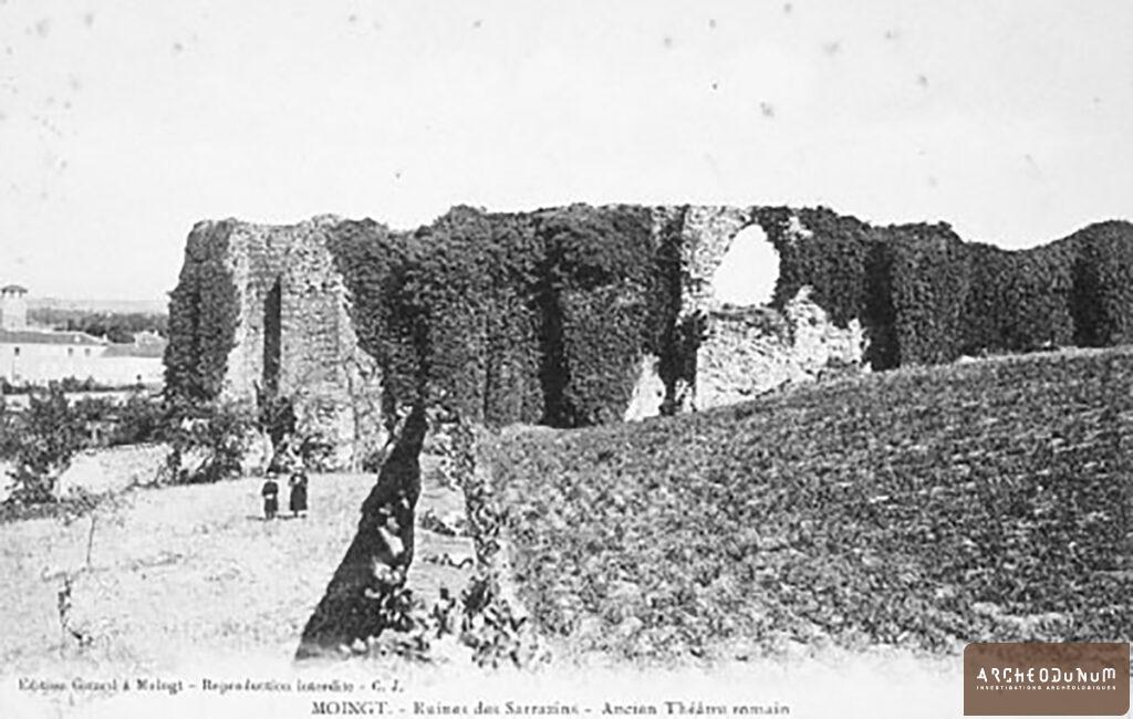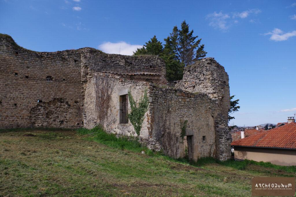 L’histoire récente du château est marquée par de nombreuses destructions, et le châtelet est un des derniers bâtiments qui matérialisent l’ancienne puissance du lieu. En contrebas des anciennes fortifications, le comblement du fossé (autrefois large de 20 m et profond d’au moins 10 m !) a fortement transformé la physionomie du site et de ses abords. Du fait de ces remblaiements, seule la partie supérieure du châtelet demeure visible, alors que ses tours s’enfoncent encore de plusieurs mètres sous le sol d’aujourd’hui (fig. 8).