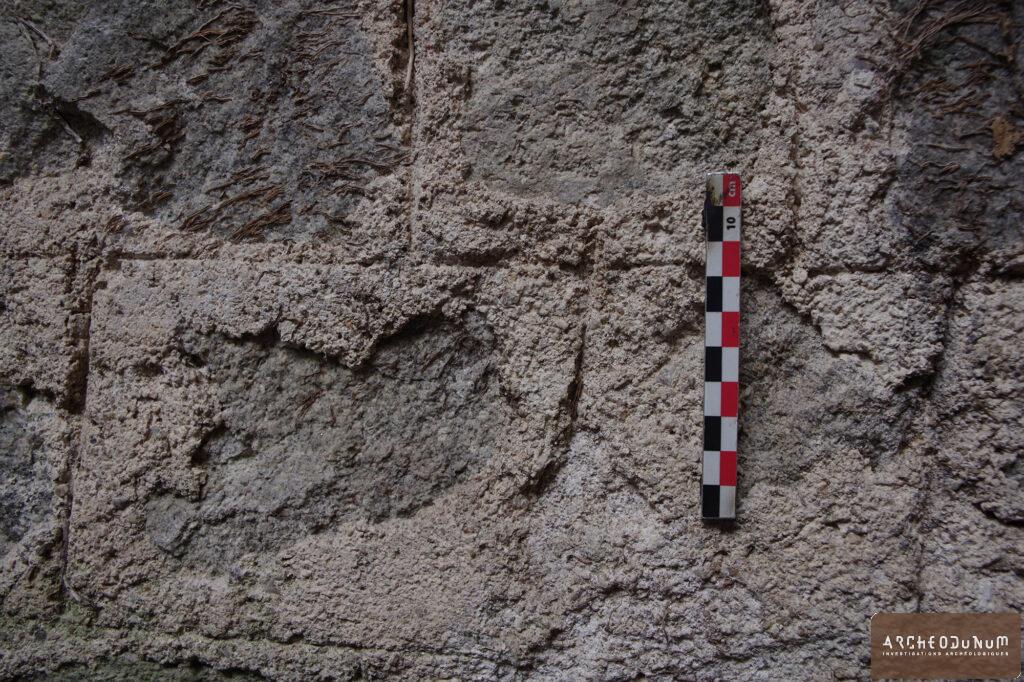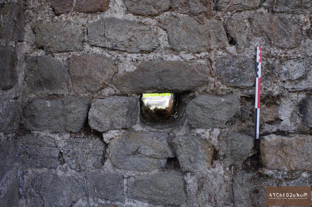 Si le secteur du châtelet avait déjà fait l’objet d’investigations archéologiques (un diagnostic en 2004, une fouille aux abords en 2015), l’édifice proprement dit restait à étudier (fig. 4). Et c’est une riche histoire que révèlent ses maçonneries ! Nos archéologues ont pu montrer qu’à cet emplacement existait une première tour, qui a ensuite servi de base à la partie sud du châtelet. Ce premier édifice, qui reste à dater, est aujourd’hui conservé en plan sur une moitié seulement, et sur deux niveaux. Le sous-sol accueillait une salle de stockage voûtée, et une fosse à latrines. Au-dessus, deux pièces à vivre équipées de cheminées, éclairées par une baie, témoignent de la fonction résidentielle de l’ensemble (fig. 5).