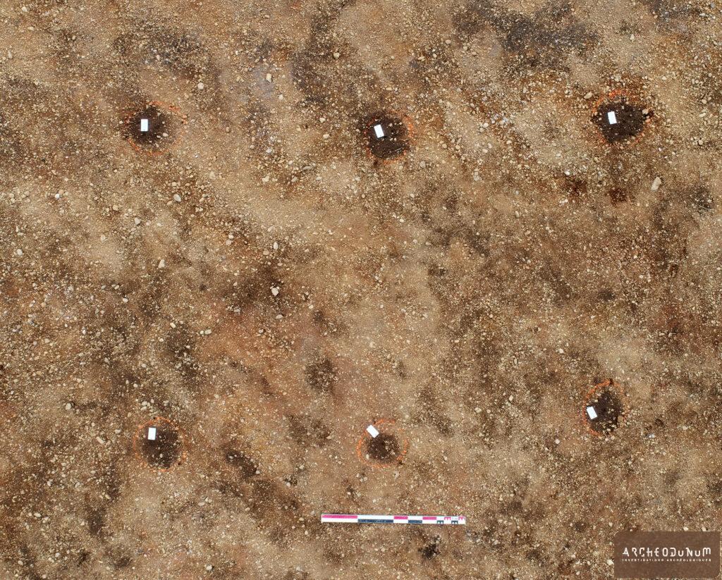 À la fin de l’été 2024, les archéologues d’Archeodunum ont investi une surface de 1350 m2, située à l’extrême sud-ouest de la commune Lacroisille. La zone occupe le versant méridional d’une colline, avec une pente marquée de plus de 11 % (fig. 1). Le site repose sur un calcaire dur, caractéristique du « régime de Briatexte », qui a freiné l’érosion et préservé les vestiges. Ces conditions ont permis de révéler une richesse inattendue : près de 60 vestiges et une cinquantaine de strates archéologiques (fig. 2).