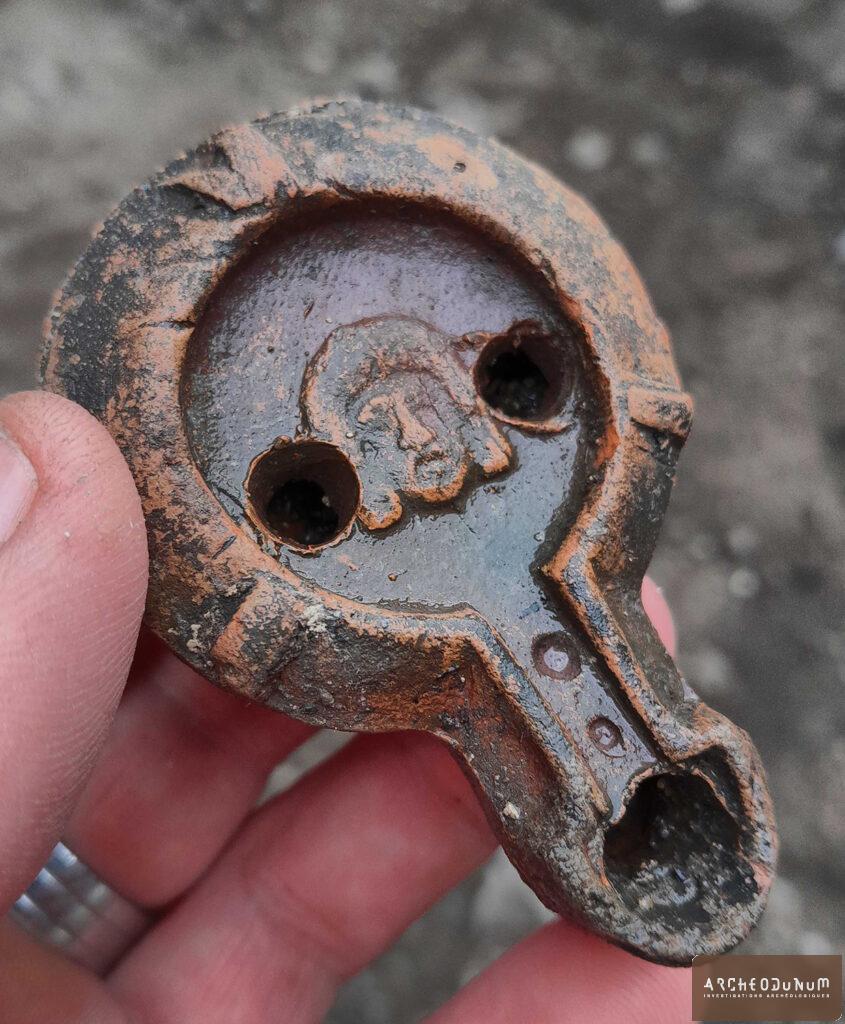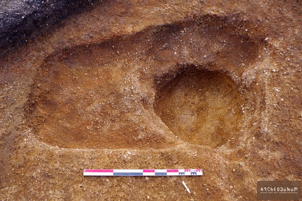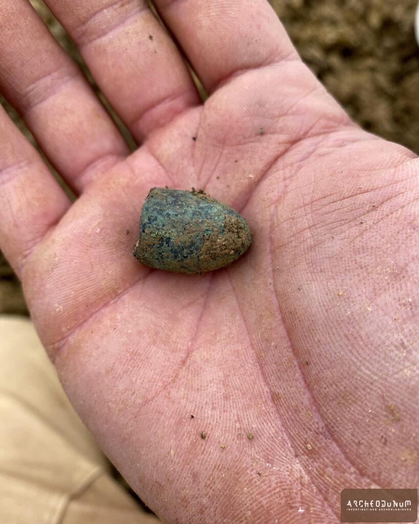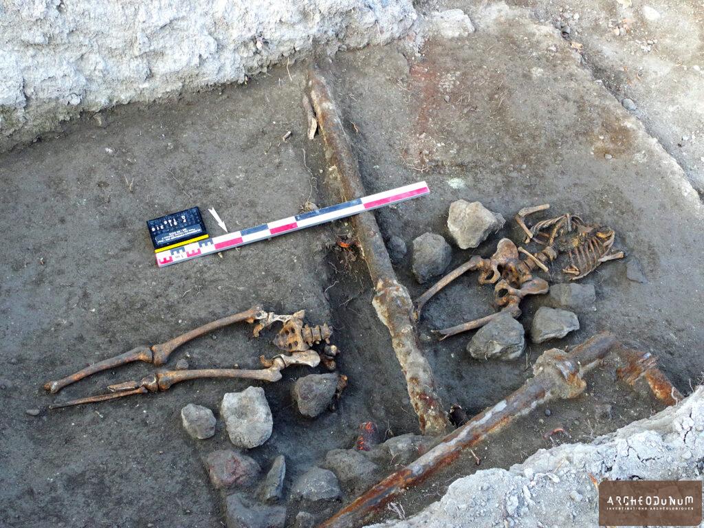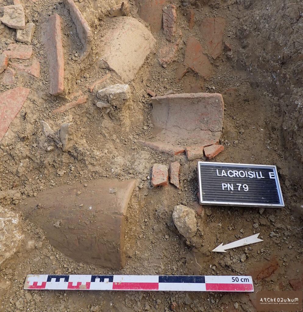 Notons la découverte d’un fragment de céramique romaine brûlée (pied annulaire de sigillée) et de quelques esquilles d’os crémés (identification humaine non possible), disséminés dans les comblements de plusieurs sépultures, qui témoignent pour la première fois d’une possible présence à l’époque romaine dans le secteur.