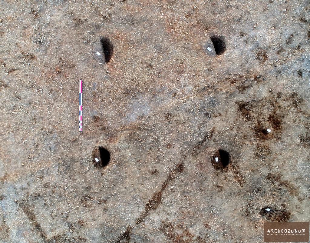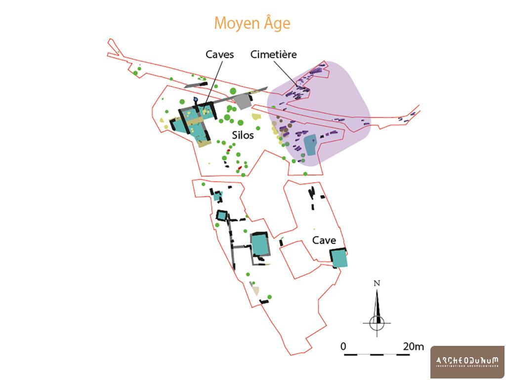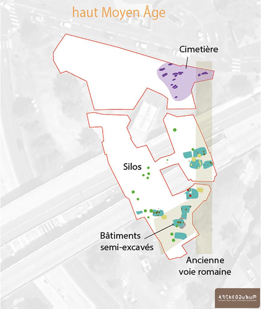 La majorité des creusements mis au jour se rattachent au premier Moyen Âge (époques mérovingienne et carolingienne). Un fond de cabane muni de quatre poteaux corniers, d’un trou de poteau central et d’une tranchée d’implantation des parois a par exemple été mis au jour à l’est de l’emprise investiguée. Son comblement a livré une quinzaine de tessons de céramique bistre et quelques charbons pour lesquels une analyse radiocarbone a été réalisée et dont les résultats ont donné un âge calibré situé entre 410 (95.4%) et 550 cal. AD. Quelques plans de bâtiments ont pu être proposés, parmi lesquels celui d’un édifice à deux nefs et pignon en abside dont l’abandon pourrait se situer au cours du IXe s.
