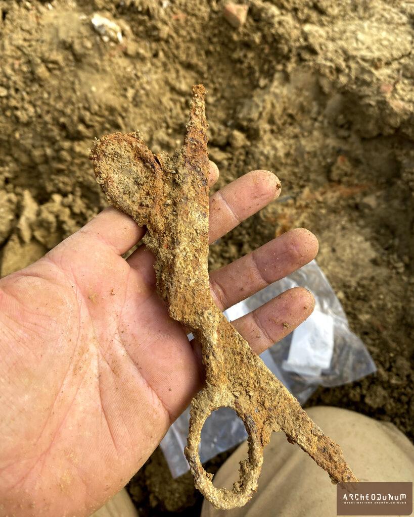 Les remblais recouvrant les bâtiments ont livré un riche mobilier métallique : ciseaux, burins, couteau, dé à coudre, anneaux et éléments d’huisserie (fig. 5 à 7). Une petite clé trouvée près d’un seuil figure parmi les découvertes les plus plaisantes. Le site comprend également une canalisation, des silos et des structures en creux dont la fonction reste à définir (fig. 8). Ces éléments complètent le tableau d’une activité humaine variée.
