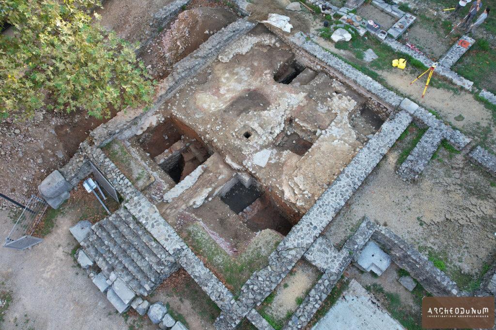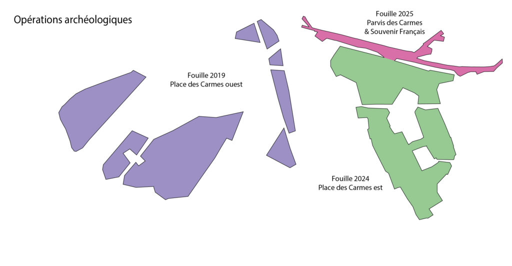 En été 2019, durant 18 semaines, une équipe d’Archeodunum sous la direction de Marco Zabeo a investi la partie occidentale de la place des Carmes. La fouille a vu la mise au jour d’une villa antique et de sépultures d’enfants associées à des inhumations de chiens. Des fosses médiévales, des sépultures et des sous-terrains contemporains complètent le tableau.