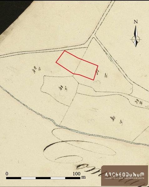 Fig. 9 : Le cadastre napoléonien daté de 1840 ne montre ni construction ni chemin à l’emplacement de la fouille. Fond © francearchives.gouv.fr