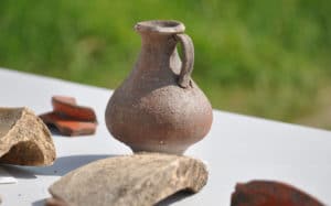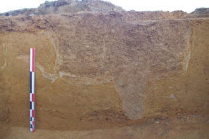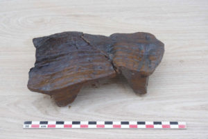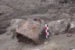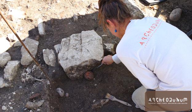 Les bâtiments laissés à l’abandon offrent de belles opportunités pour récupérer des matériaux de choix et construire de nouveaux édifices. C’est ce que l’on observe dans les bâtiments environnants, parfois même dans les maison modernes. Les éléments non valorisables ont été évacués dans de grandes fosses. C’est dans l’une d’elles qu’a été retrouvé un pied de statue en pierre (fig. 9). D’autres fosses, ont pu servir à l’extraction de matériaux naturels.