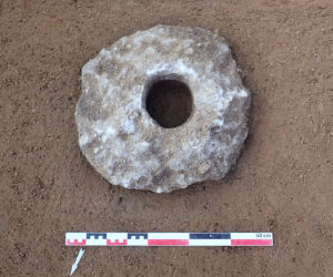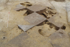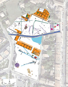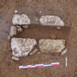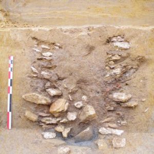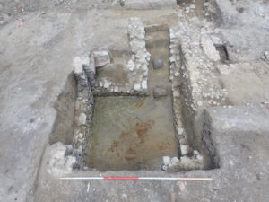À la périphérie orientale de l’emprise, un aménagement maçonné de 7,15 x 4,70 m, et encaissé d’environ un mètre dans le substrat, a été partiellement dégagé (fig. 5). Il est construit à l’aide d’imposants blocs de taille en calcaire (certains atteignent 90 cm de longueur !) ; le fond n’est pas aménagé. L’hypothèse d’un bassin d’agrément est envisagée, bien que certains arguments s’y opposent. Des analyses chimiques sont en cours pour préciser la nature et la fonction de cette construction.