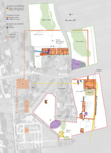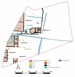 Le temple prend place au sein d’une cour empierrée, fermée par un mur d’enceinte dont seule la partie nord nous est parvenue. De très nombreuses fosses ont été recensées dans cet espace ouvert (fig. 4), mais rares sont celles liées à l’activité du sanctuaire. L’une d’entre elles contenait des ossements animaux pouvant résulter d’un sacrifice. D’autres fosses pourraient signaler la présence de plantations, témoignant d’un aménagement paysager. L’ensemble suggère une occupation structurée de l’espace.