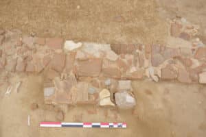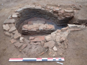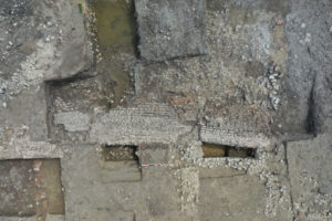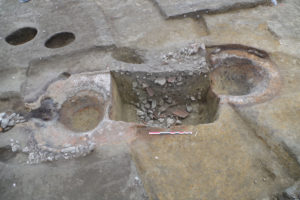 Après l’abandon du sanctuaire, des aménagements plus modestes sont venus s’implanter dans les ruines du temple. Des trous de poteau et un petit foyer (constitué de fragments de tuiles) signalent la présence de constructions légères à usage probablement artisanal (fig. 6 et 7). Une canalisation maçonnée traversant le site atteste par ailleurs une activité de gestion hydraulique postérieure à l’occupation cultuelle (fig. 8).