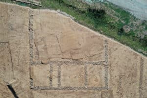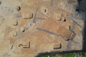 Lorsque les archéologues ont démarré l’opération, ils ne s’attendaient pas à trouver des vestiges en si grand nombre, ni d’une telle nature. Le coeur des découvertes est un temple gallo-romain (fig. 2). Ce type d’édifice, appelé fanum par les spécialistes, se caractérise par un plan centré constitué de deux carrés concentriques. Seules les fondations sont conservées, mais elles permettent d’identifier avec certitude une pièce centrale (cella), qui accueillait la statue de la divinité, et une galerie périphérique, fréquentée par les fidèles (fig. 3). Si ce genre d’édifice est bien connu dans le monde gallo-romain, les nouvelles découvertes demeurent exceptionnelles.