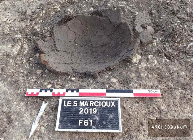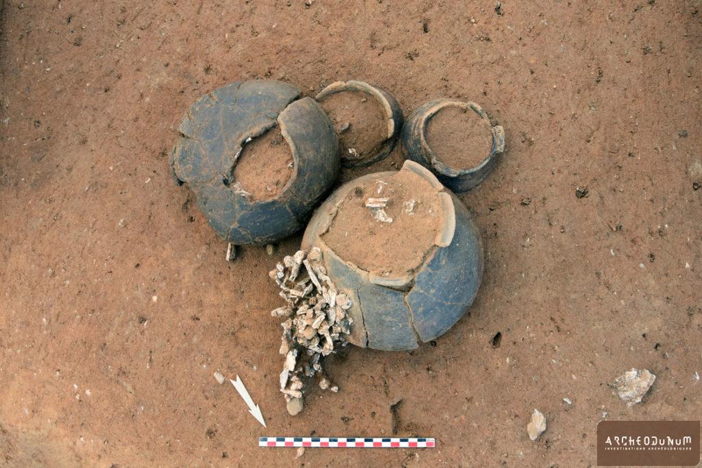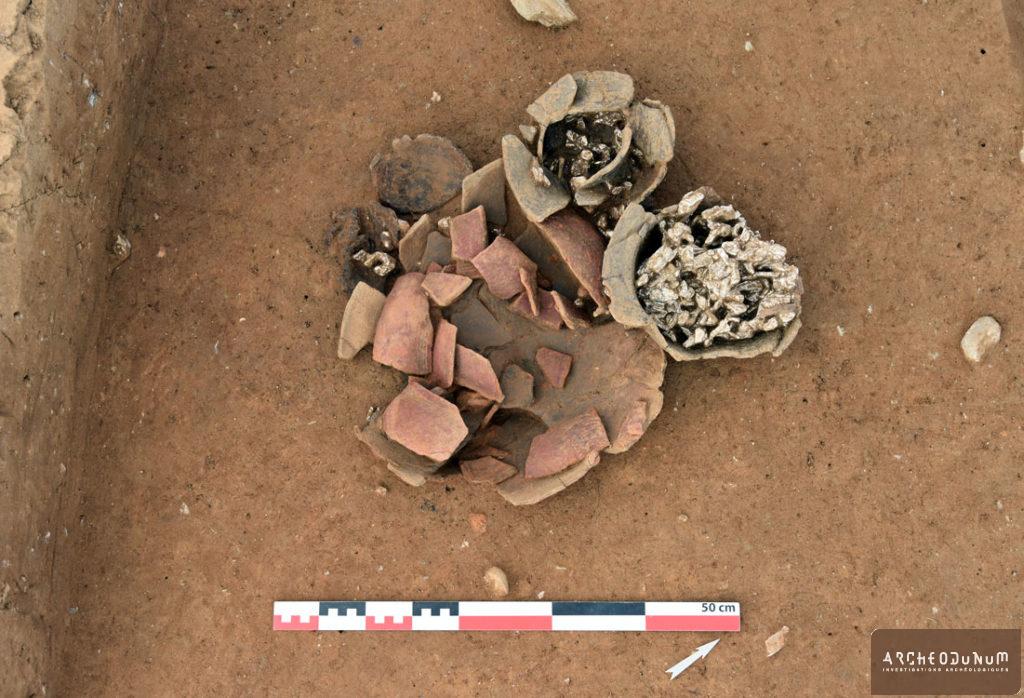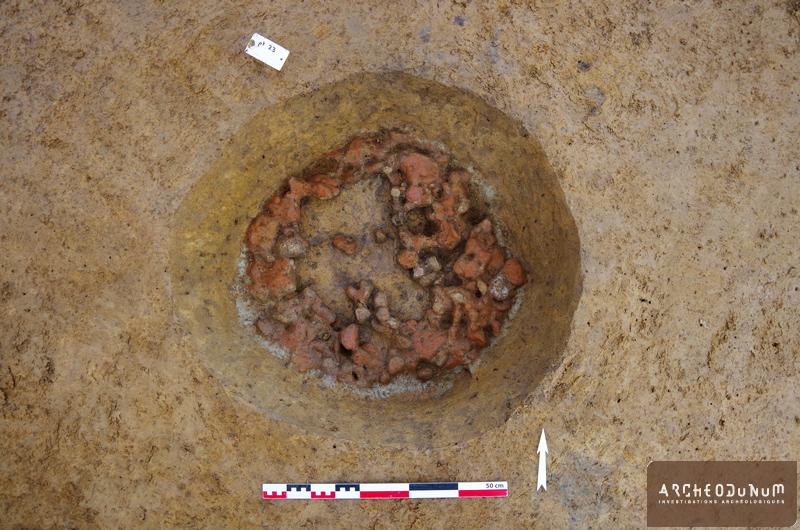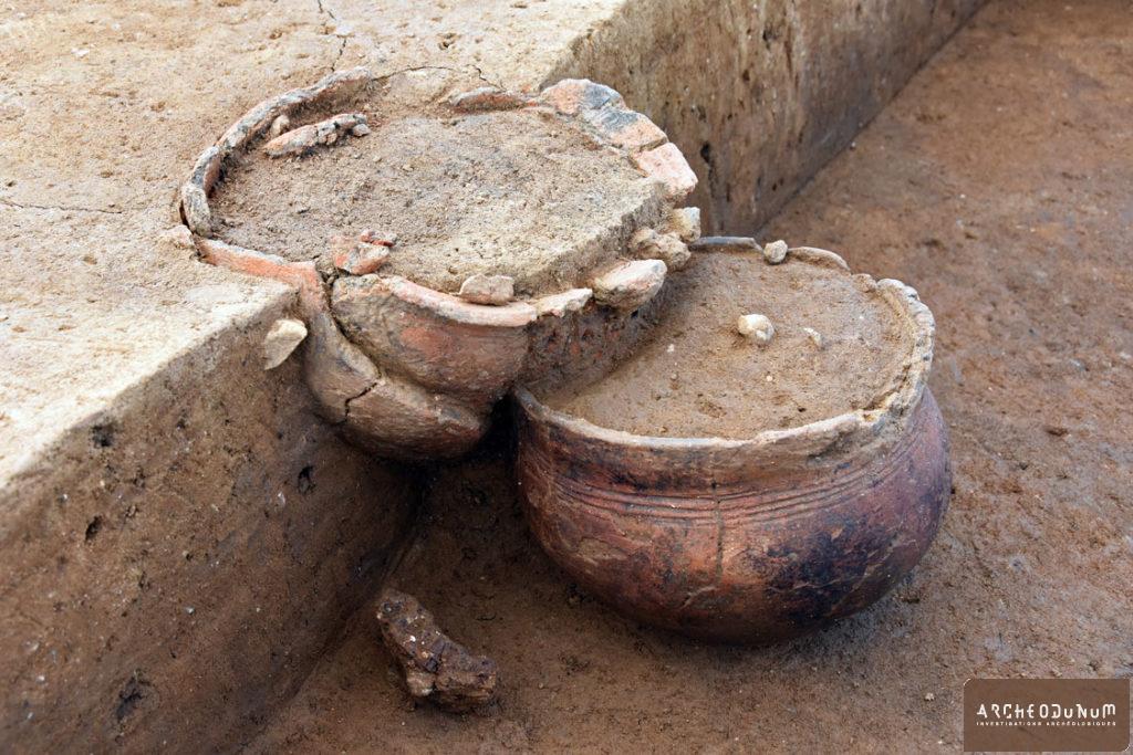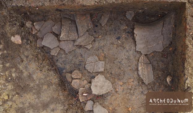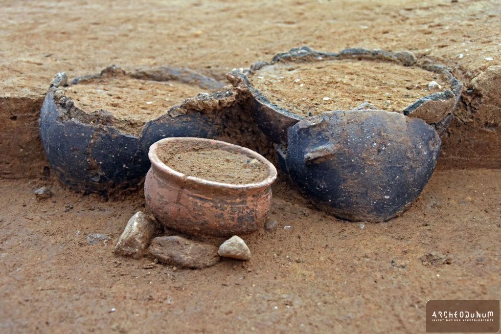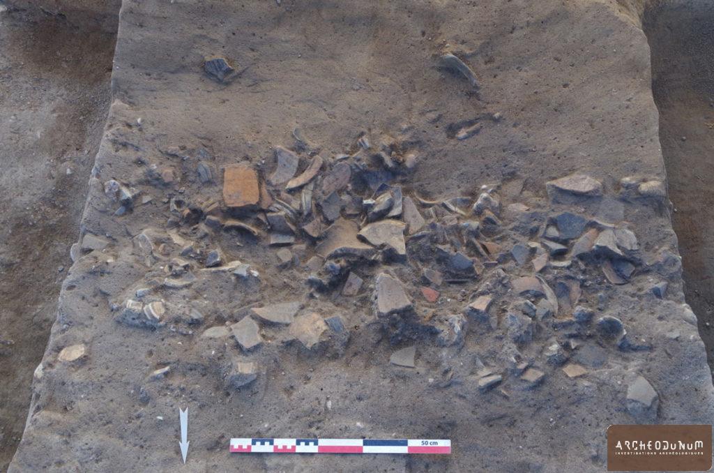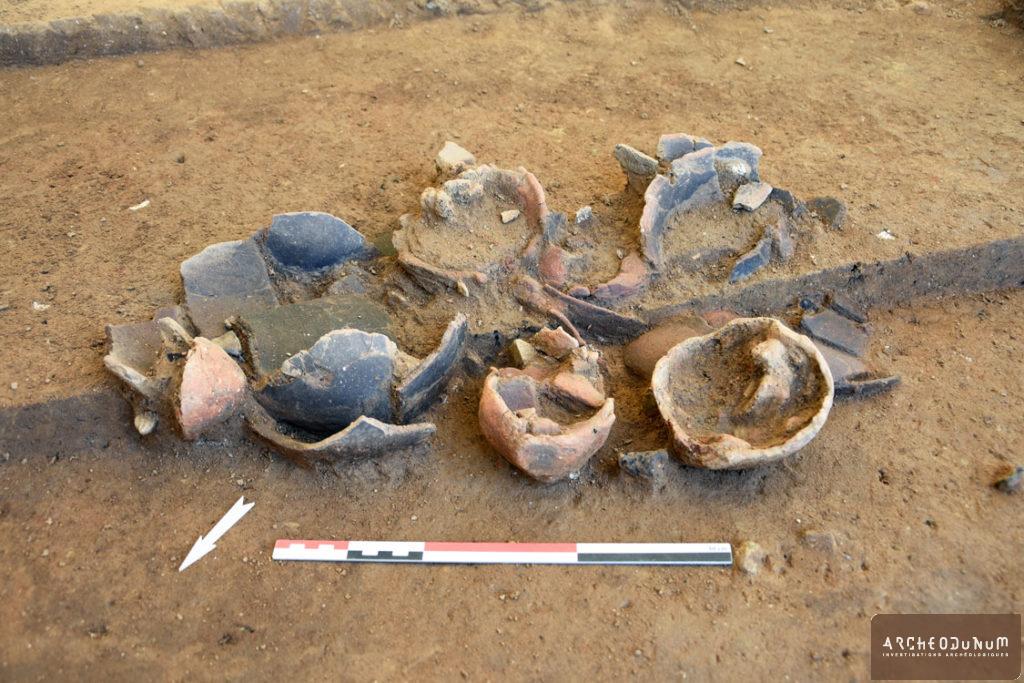 À l’extérieur de l’enceinte, on a trouvé plusieurs greniers sur 4 poteaux, ainsi que trois silos ayant servi au stockage enterré des récoltes (fig. 5). L’un d’eux a livré une très grande quantité de céramiques datées de la fin du Bronze final (fig. 6). L’habitat est accompagné de vastes fosses dites « polylobées », résultant de l’extraction des matériaux utilisés pour les maisons ou les céramiques.
