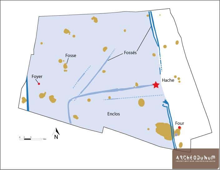 Les vestiges les plus anciens du site de Luyères sont trois grandes fosses datées de la fin du Néolithique (2800-2500 av. J.-C.). Elles présentent une forme caractéristique dite « en Y », de près de 2,50 m de profondeur, avec une ouverture fortement évasée en surface et une partie basse verticale très étroite (40 cm de large) (fig.1). Si la fonction de ces grands aménagements fait encore débat au sein de la communauté scientifique, on pense qu’ils servaient de pièges de chasse. L’étude des coquilles de mollusques (la malacologie) retrouvées dans les comblements a permis de reconstituer un paysage densément boisé à cette époque : cela permet un peu plus d’imaginer l’utilisation de ces fosses pour la capture des animaux forestiers, notamment des grands herbivores sauvages tels que les cerfs ou les aurochs.