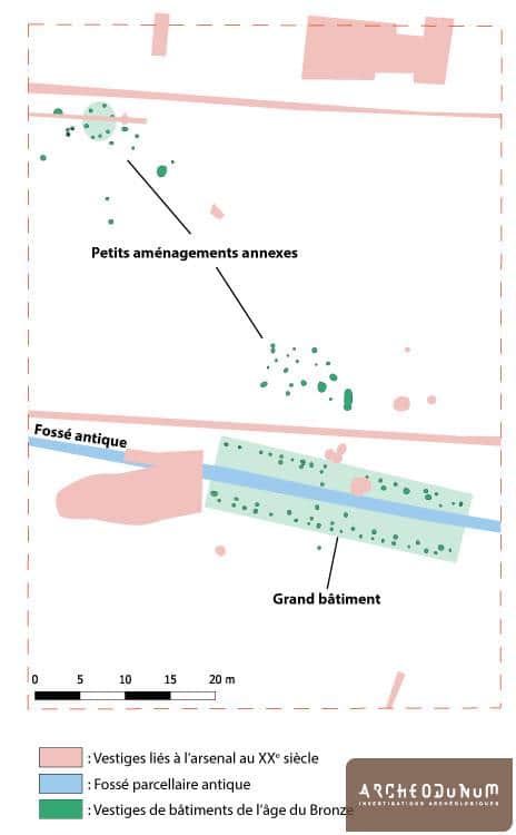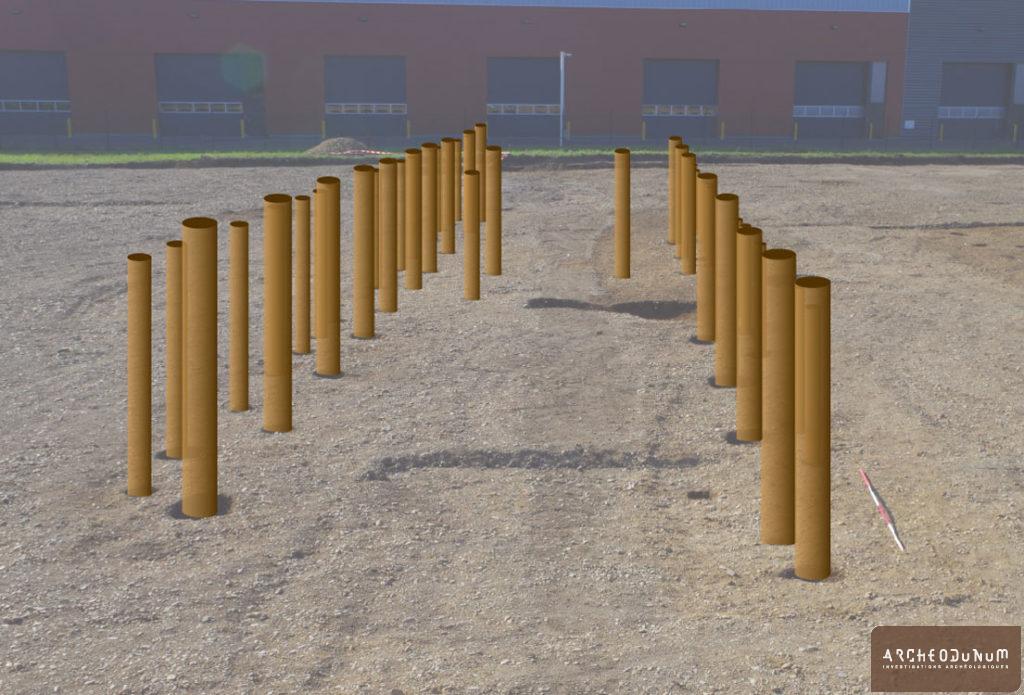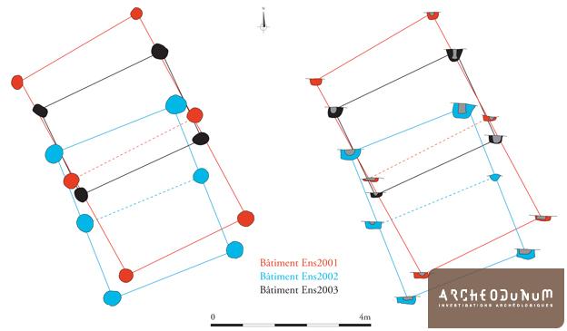 Deux des bâtiments se trouvent à l’intérieur d’une grande enceinte ovalaire de près de 7500 m² (fig.2). Son tracé prend la forme d’un fossé ayant accueilli une palissade et, probablement, des sections de murs en terre crue.