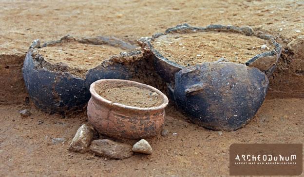 Le diagnostic s’est avéré fructueux, puisqu’il a permis la découverte de deux premières tombes à crémation et de plusieurs fragments de récipients en céramique, laissant présager l’existence d’un site protohistorique inédit. En conséquence, des fouilles archéologiques préventives, confiées à l’entreprise Archeodunum SA, sous la responsabilité de Dorian Maroelli, ont débuté le 14 juin dernier pour assurer l’enregistrement des vestiges et le prélèvement des objets. Elles ont déjà permis d’explorer 8’500 m² de terrain et mettent en évidence la richesse insoupçonnée du gisement. Une centaine de structures archéologiques, réparties sur une surface d’au moins 4’000 m², sont ainsi déjà recensées. Près de la moitié d’entre elles correspondent à des fosses sépulcrales renfermant les restes de défunts incinérés, associés à des vases d’accompagnement.