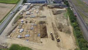 Vue aérienne du site (en direction de l’ouest), avec la route cantonale à gauche et la gare de triage à droite