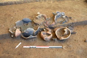 Détail d’une sépulture à crémation contenant un dépôt complexe de 19 vases (pots, écuelles, gobelets)