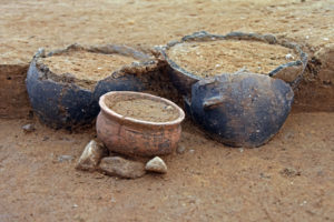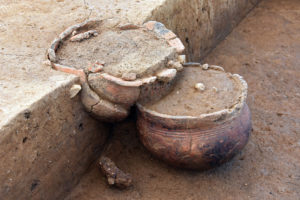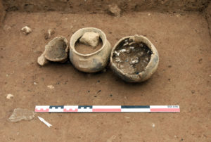 Dépôt funéraire constitué d’un ossuaire (à droite) et de deux vases d’accompagnement