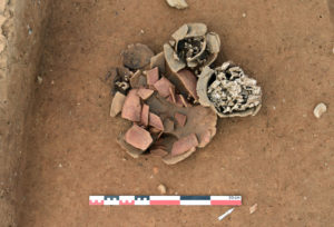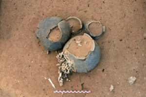 Vase ossuaire et concentration d’ossements calcinés (en bas), vase biconique (à gauche) et gobelets (en haut)