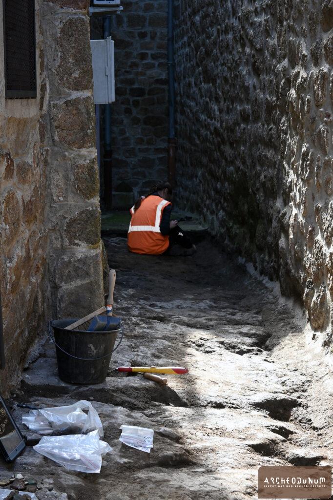 La tour est construite directement sur le substrat rocheux (fig. 8). Celui-ci a conservé quelques traces d’occupations successives dans les rues adjacentes, à l’exemple des fondations des murs des états antérieurs. De plus, un puits circulaire taillé dans la roche a été partiellement dégagé (fig. 9). Son comblement n’a pas été exploré et il demeure délicat d’en proposer une datation. Une canalisation était également conservée en partie. Elle suit le même axe que la rue nord/sud qui longe la tour et devait servir à évacuer les eaux au Moyen Âge et à la période moderne.