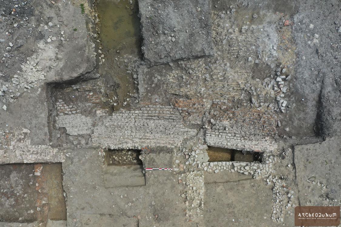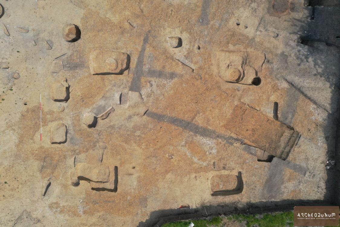 Enfin, la fouille a révélé quelques indices d’une occupation médiévale et moderne, correspondant notamment à un réseau de fossés parcellaires, au passage d’un ancien chemin d’orientation est-ouest et à la construction de deux petits bâtiments – dont un reprenant pour partie des soubassements antiques – probablement en lien avec les fermettes au nord du bourg.