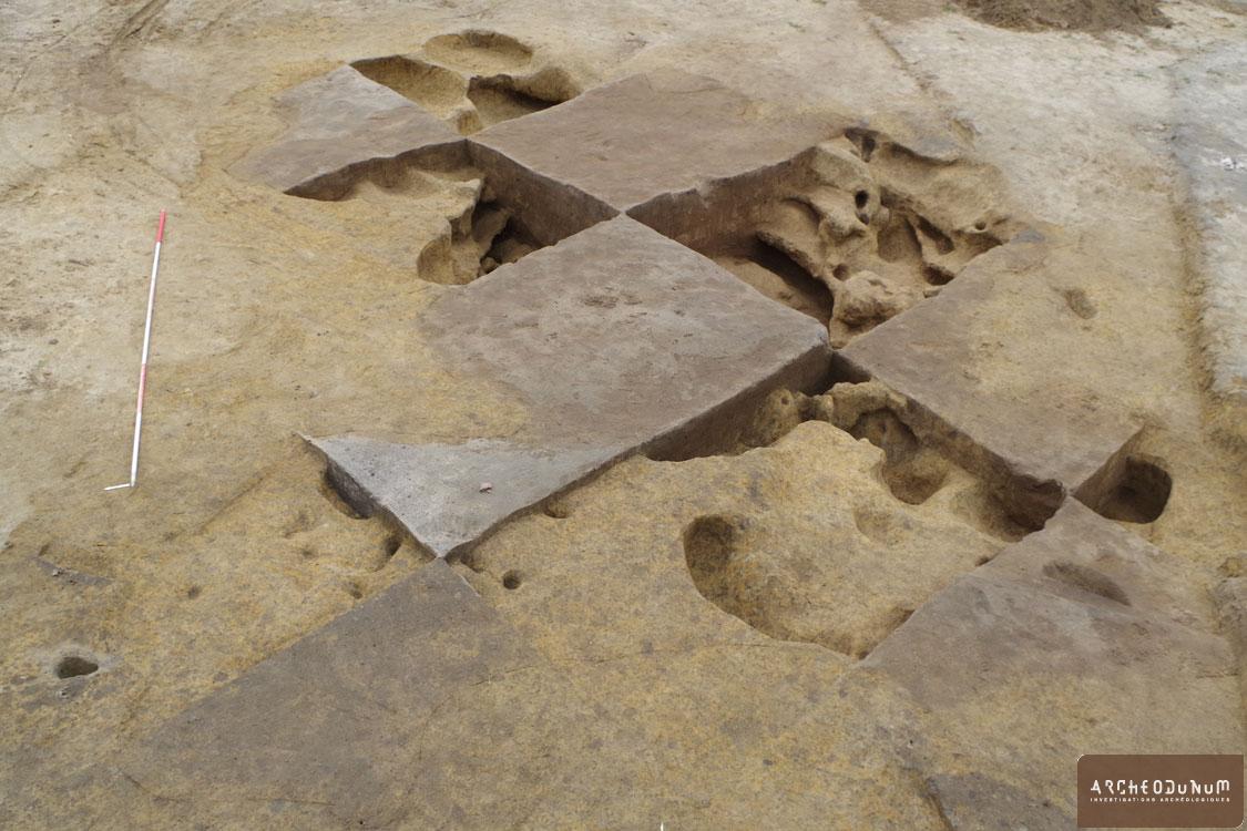Cette pars urbana fait face à une cour agricole bordée au nord par plusieurs bâtiments en enfilade. Ceux-ci constituent l’aile septentrionale de la pars rustica. La première construction, localisée dans l’angle nord-ouest, correspond à un grand bâtiment technique d’une surface de 520 m². Il se compose d’un grand espace central de près de 200 m² bordé par des pièces de différentes tailles. Au sud, l’accès se fait par une galerie ouvrant sur la cour agricole. Étant donné la profondeur des fondations qui encadrent l’espace central, celui-ci devait être couvert, voire devait supporter un étage. À l’image du bâtiment résidentiel, celui-ci semble avoir connu au moins quatre états distincts, dont la chronologie est là encore difficile à assurer. Globalement, les indices mobiliers recueillis permettent d’attester un usage du milieu du ier au ive siècle de notre ère. Durant cette occupation, le bâtiment se dotera d’un cellier, puis d’une cave maçonnée et d’une pièce semi excavée équipée d’un puissant sol en béton de tuileau peut-être destinée à l’élevage d’animaux. Construit en bordure d’une dépression, le mur oriental subira plusieurs aléas. Deux états de murs en léger décalage ont ainsi été identifiés. Le second sera construit sur radier de fondation, avec un soubassement maçonné au mortier de tuileau, et sera retenu par deux contreforts. Malgré cette évolution technique, la partie sud du mur s’effondrera dans la dépression. Plus tard, au ive siècle, les occupants de la villa mettront à profit cette ouverture pour pratiquer un second accès au bâtiment. Bien que les niveaux de sols soient inexistants dans le bâtiment, des analyses géochimiques ont permis de mettre en évidence des différences notables d’un espace à un autre. Ainsi, certaines pièces pouvaient accueillir du bétail alors que d’autres étaient destinées au stockage. Ces données confirment le caractère multiple des activités pratiquées dans cette grande construction. La présence de bétail est en outre confirmée par l’aménagement d’une fosse à fumures dans la dépression jouxtant le bâtiment. Il s’agit d’une grande fosse de 294 m² dont les parois sont grossièrement maçonnées et le fond est empierré. L’analyse géochimique couplée à aux études micromorphologique et des phytolites corroborent l’hypothèse d’une fosse à fumure. Après l’effondrement du mur oriental du bâtiment, une seconde fosse à fumure sera aménagée légèrement plus au sud. Lors de son abandon, cette dernière accueillera une grande quantité de déchets essentiellement datés du IVe siècle. En l’absence de niveaux de sols, la fonction des autres bâtiments de l’aile nord de la pars rustica n’est pas connue. Seul l’un d’entre eux livre une petite pièce semi-excavée dont le fond présente des cupules peut-être destinées au calage de vases de stockage.