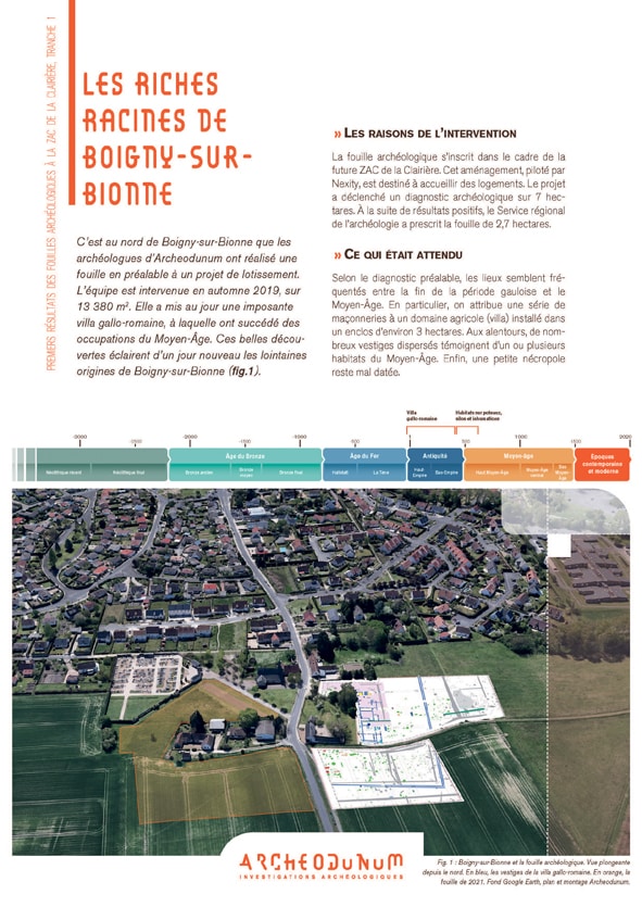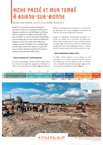 L’opération de fouille archéologique préventive de la ZAC de la Clairière à Boigny-sur-Bionne (45) s’est déroulée en deux tranches opérationnelles du 30 septembre au 13 décembre 2019 et du 15 mars au 18 juin 2021. Elle s’inscrit dans le cadre d’un projet d’aménagement de ZAC destinée à accueillir 140 logements. L’emprise de ce projet piloté par Nexity Foncier Conseil Centre a fait l’objet d’un diagnostic archéologique réalisé par le Service de l’Archéologie Préventive du département du Loiret, sous la responsabilité de Karine Payet-Gay en octobre 2018. Ce diagnostic a permis d’identifier de nombreuses structures matérialisant une occupation longue, depuis La Tène finale à l’époque contemporaine, avec en point d’orgues la découverte d’une villa antique.