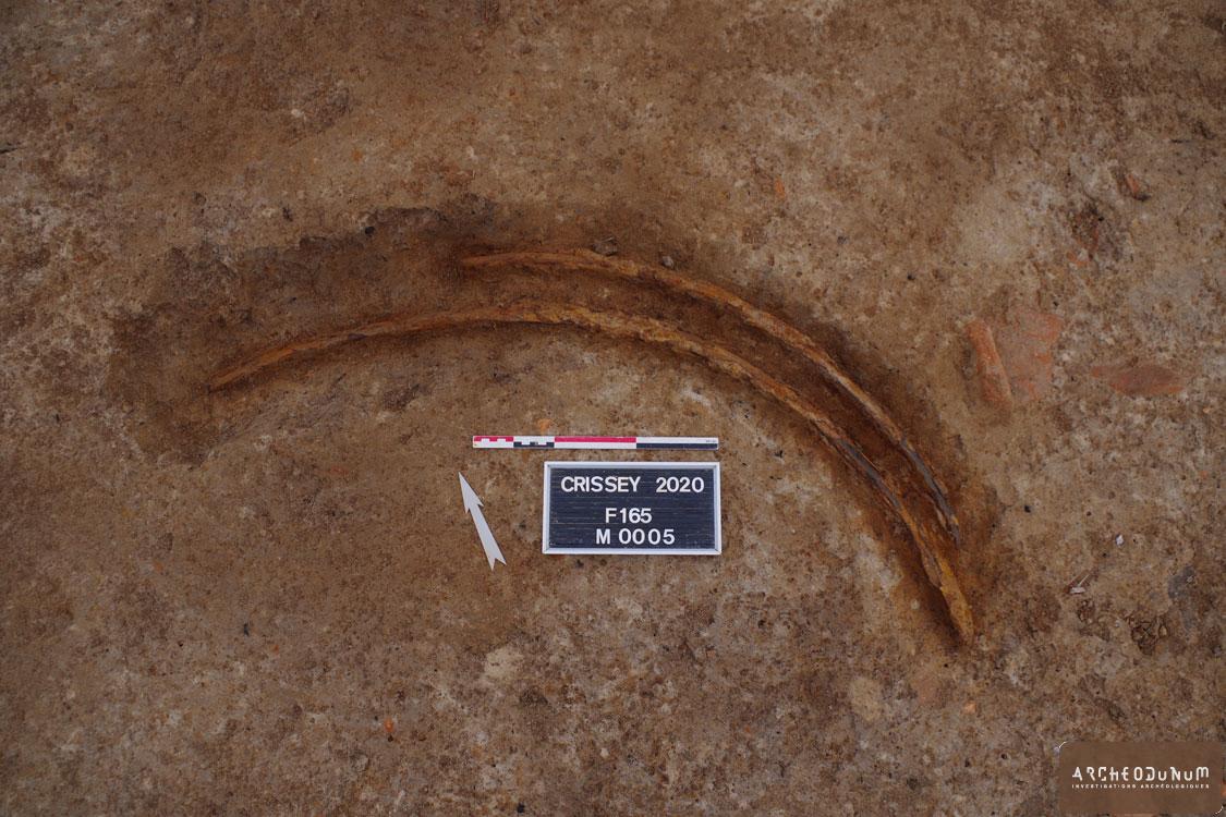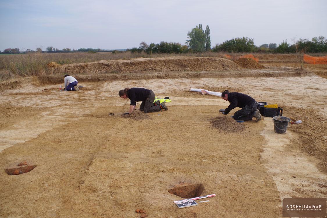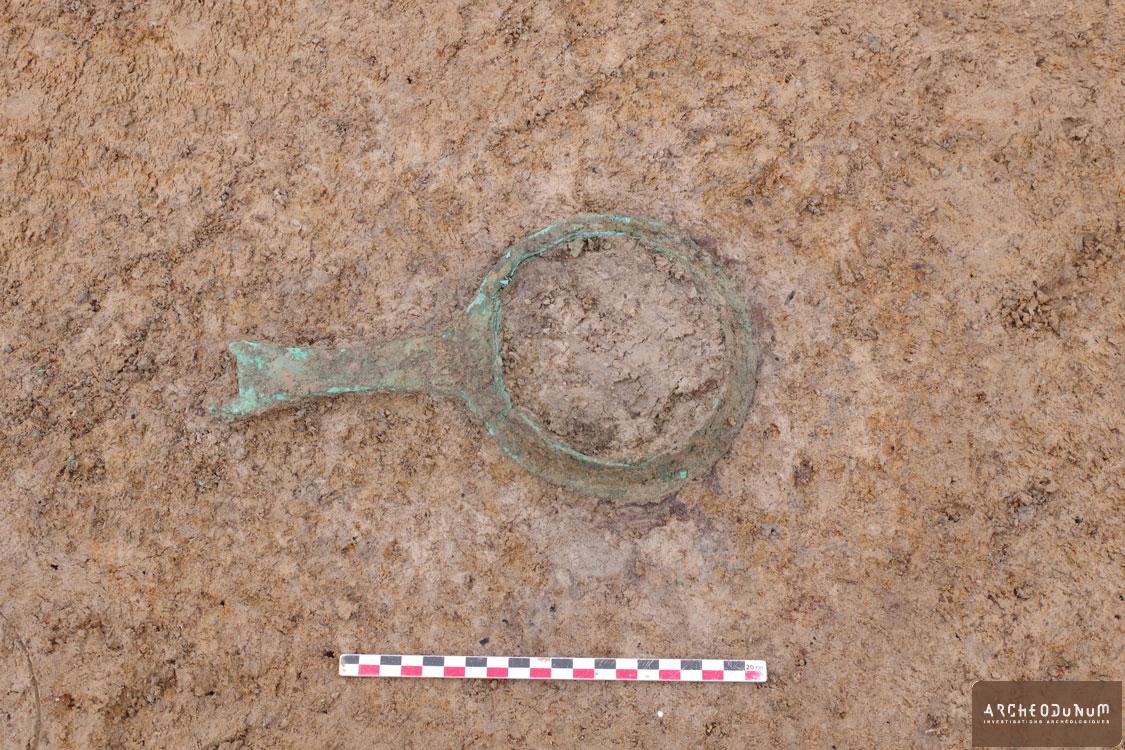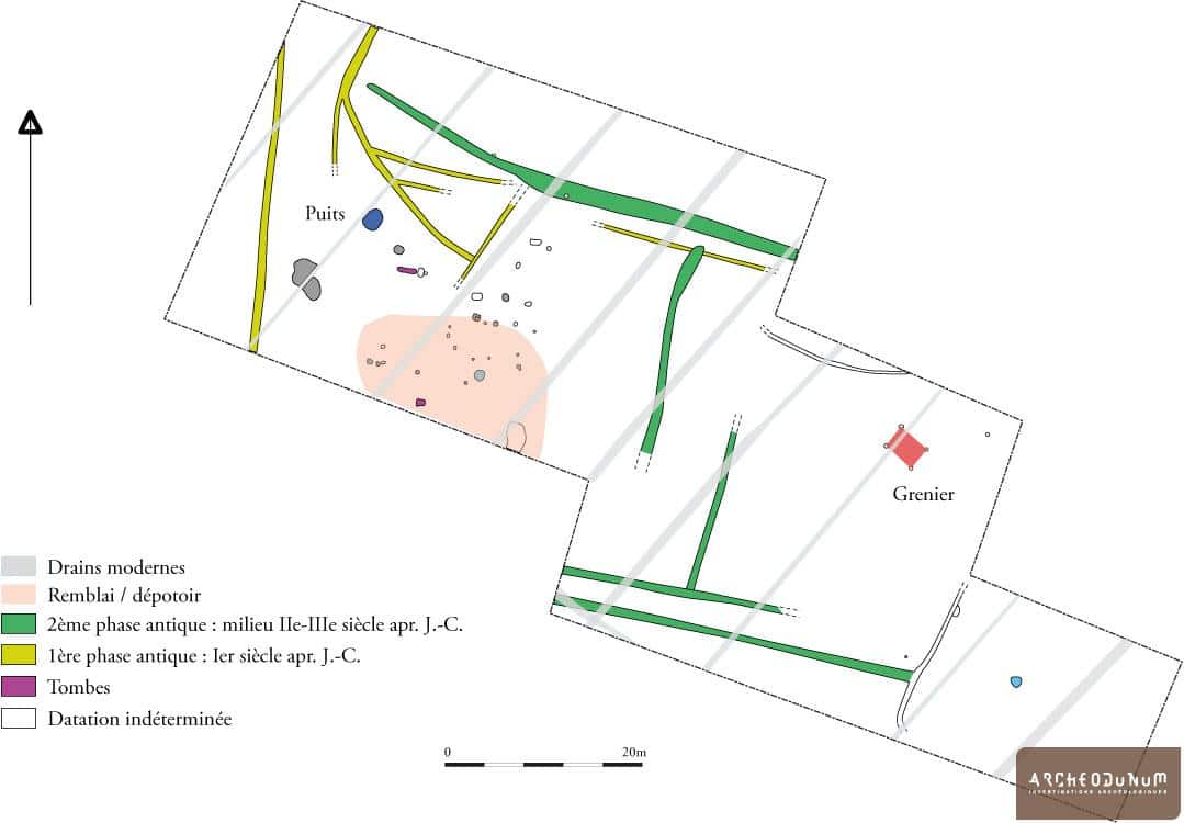La fouille a porté sur une superficie de 3595 m² et a livré des vestiges assez fugaces mais néanmoins intéressants qui couvrent l’âge du Fer et l’Antiquité. Une inhumation (voire deux) non datée a également été mise au jour. Une fosse datée du Hallstatt D1 a été fouillée lors de l’opération de diagnostic (Chevrier 2020), tandis que la fouille extensive a permis de révéler la présence d’un petit grenier sur quatre poteaux, daté de La Tène finale. Ces deux découvertes sont isolées mais permettent d’envisager des occupations protohistoriques dans un environnement proche. L’Antiquité, et plus spécifiquement le Haut Empire, représente la période la mieux documentée bien que le statut du site n’ait pu être établi (occupation domestique et/ou agraire). En effet, les structures sont arasées, peu nombreuses et aucune véritable organisation ne ressort du plan général. L’étude céramologique a pu établir deux horizons chronologiques, le premier au Ier siècle apr. J.-C. et le second au milieu du IIe-IIIe siècle apr. J.-C. Les structures les plus caractéristiques sont un puits, des fossés, quelques trous de poteau, et un important remblai qui a permis de recueillir la majorité du mobilier, et qui permet de proposer un abandon du site au IIIe siècle. Ce mobilier est peu abondant mais diversifié et recèle quelques éléments remarquables qui traduisent un statut social aisé. Certains fossés ont par ailleurs livré des vases en céramique ouvrant la discussion sur de possibles éléments de bornage.