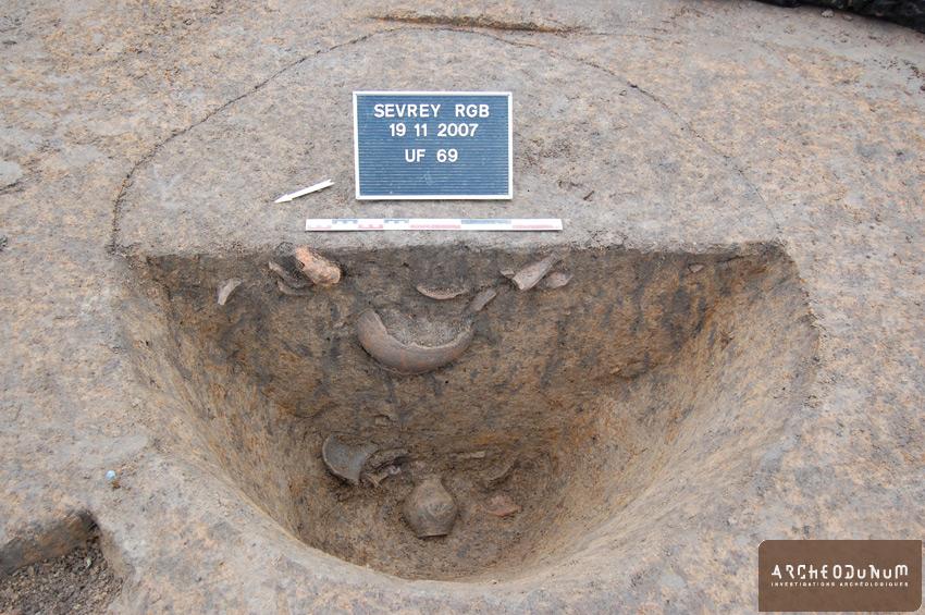 Les fouilles archéologiques de la Rue Georges Brusson sont d’un grand intérêt pour la connaissance de l’évolution des ateliers de potiers et de leurs productions à Sevrey au Moyen Âge, et de l’occupation du Haut Moyen Âge à l’Époque Moderne dans cette partie du village. Si les quelques fragments de matériaux de construction en terre cuite et petits moellons calcaires recueillis sur le site proviennent assurément d’un bâtiment antique important situé dans les proches environs, aucun autre vestige antique n’a été trouvé sur le site. Les premières traces d’une occupation du Haut Moyen Âge appartiennent à un fossé parcellaire orienté au sud-ouest/nord-est et qui se prolonge au-delà du site. Sa datation reste incertaine. Il est abandonné et comblé au moment de l’occupation qui lui succède. Des bâtiments d’habitation et/ou artisanaux en bois sont implantés selon la même orientation directrice que le fossé antérieur. Un bâtiment de plan irrégulier a pu être reconnu parmi les nombreux alignements de trous de poteaux. Bien que sa fonction reste indéterminée, il semble avoir fait l’objet de différents agrandissements.