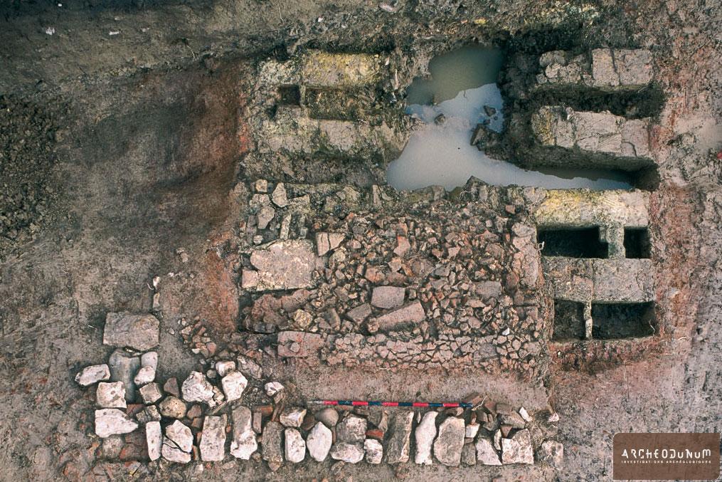 Dans le cadre de la construction d’un vaste complexe immobilier a été mis au jour un four de tuilier. Il mesure 5 m de largeur pour une longueur minimale de 3,60 m. Le mur périphérique n’est documenté que sur le côté sud ainsi que sur une petite partie du côté est. Il est conservé sur deux assises non maçonnées, constituées de blocs de calcaire.
