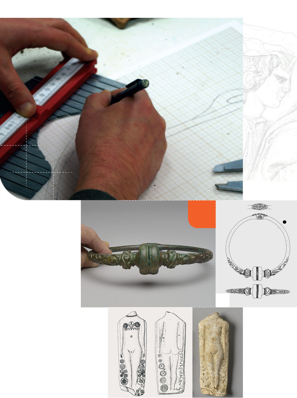 Le dessin des objets entiers ou fragmentaires fait partie du processus d’enregistrement des données d’une fouille. En accompagnement de l’étude des mobiliers, il a pour but de réaliser une image claire et normalisée. Ces représentations permettent aussi de garder la mémoire d’objets parfois fragiles et d’en assurer la diffusion auprès des chercheurs et du public.