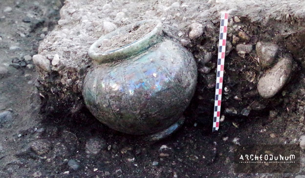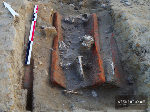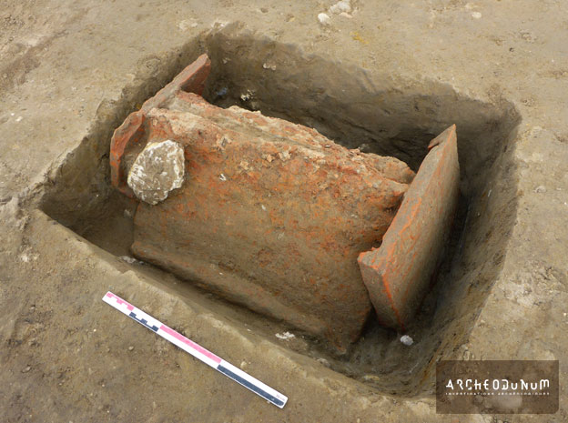 En l’absence de mobilier, seules quelques tegulae et un récipient en céramique, offrent un TPQ au IIe siècle après J.-C. Cette datation et la localisation de la nécropole permettent d’établir sa contemporanéité avec l’occupation du bâtiment.