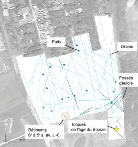 A l’instar des traces plus récentes, ce sont des indices d’exploitation agricole qui émergent. Le sud du site est ainsi parcouru par une série de fossés peu profonds, probables limites de champs ou d’enclos. Ils signalent la proximité d’une ferme des derniers siècles avant J.-C., repérée lors d’une fouille voisine en 2012.