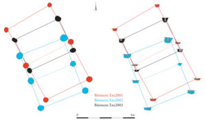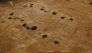 La destination agricole des lieux s’ancre dans un passé plus ancien encore. L’équipe a ainsi découvert des éléments architecturaux datés du milieu du premier millénaire avant J.-C. – une période encore mal connue dans la région. Au sud de la fouille, des bâtiments se sont succédé au même emplacement. Leur architecture recourt à des poteaux ancrés dans le sol, dont seuls les emplacements ont été reconnus (fig. 3). Nos archéologues pensent reconnaître trois constructions : deux habitations de 12 à 20 m², et un grenier de 5 m² (fig. 4).