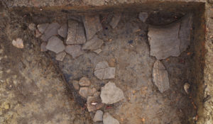 Dans l’environnement de ces bâtiments, trois grandes fosses aux formes irrégulières ont été creusés pour extraire de l’argile – peut-être destinée à la construction (fig. 5). Elles ont ensuite servi de dépotoirs. Dans leur remplissage, toute sorte de déchets qui reflètent la vie domestique – et qui font le bonheur des archéologues : restes de foyer, vases brisés, fragments de meules, ossements animaux (fig. 6).