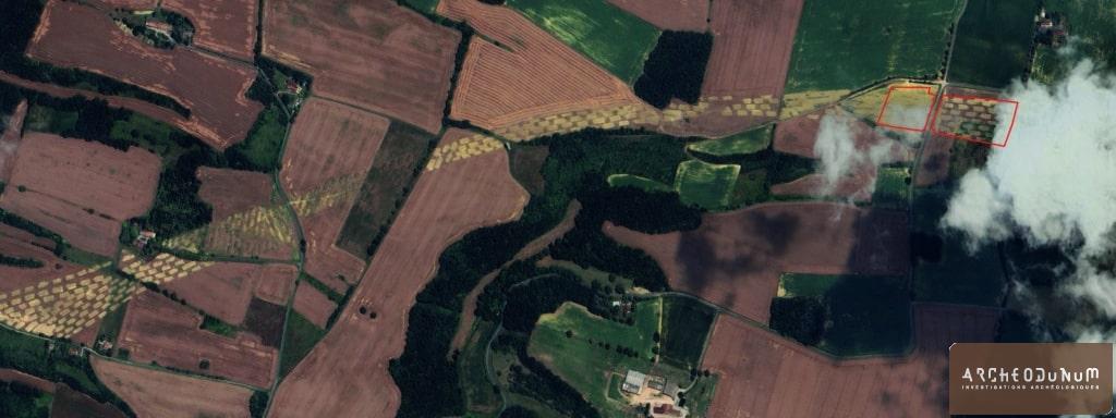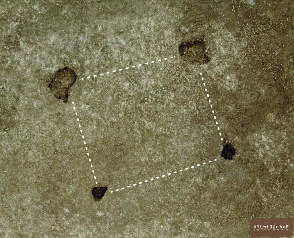 En comparant le plan des vestiges avec des photos aériennes, on peut reconnaître des traces d’aménagements récents liés à l’agriculture (fosses de plantation d’arbres ou fossés parcellaires), disparus il y a quelques dizaines d’années (fig. 6).