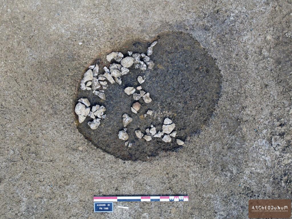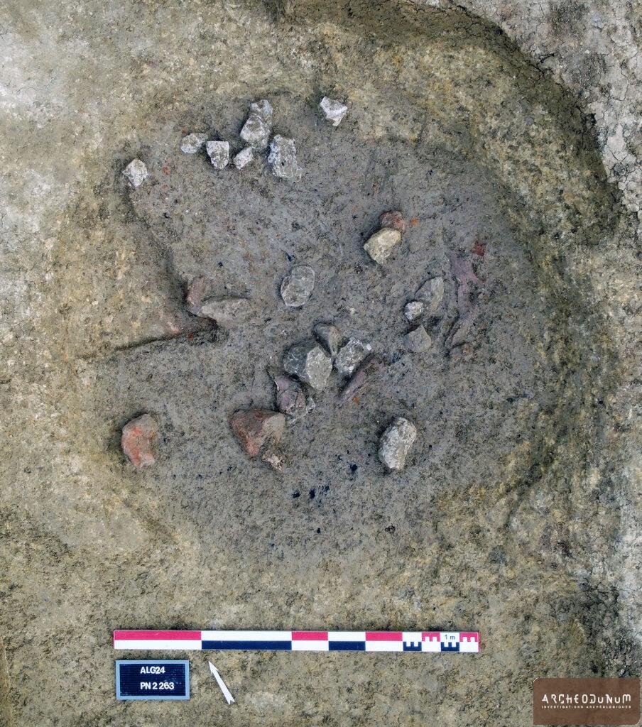 Deux structures de combustion ont été identifiées sur les parcelles fouillées. Il s’agit de foyers, installés dans des fosses plus ou moins circulaires soigneusement tapissées de couches de pierres, et destinés à la cuisson des aliments (fig. 3 et 4). L’un des deux montre une utilisation sur un temps long, avec plusieurs niveaux superposés de combustion. Grâce à des analyses radiocarbones, ces foyers ont pu être datés du début du IIIe millénaire (entre 2900 et 2600 avant notre ère), durant la période dite du Néolithique final. Le mobilier est rare et comprend de la céramique et du silex.