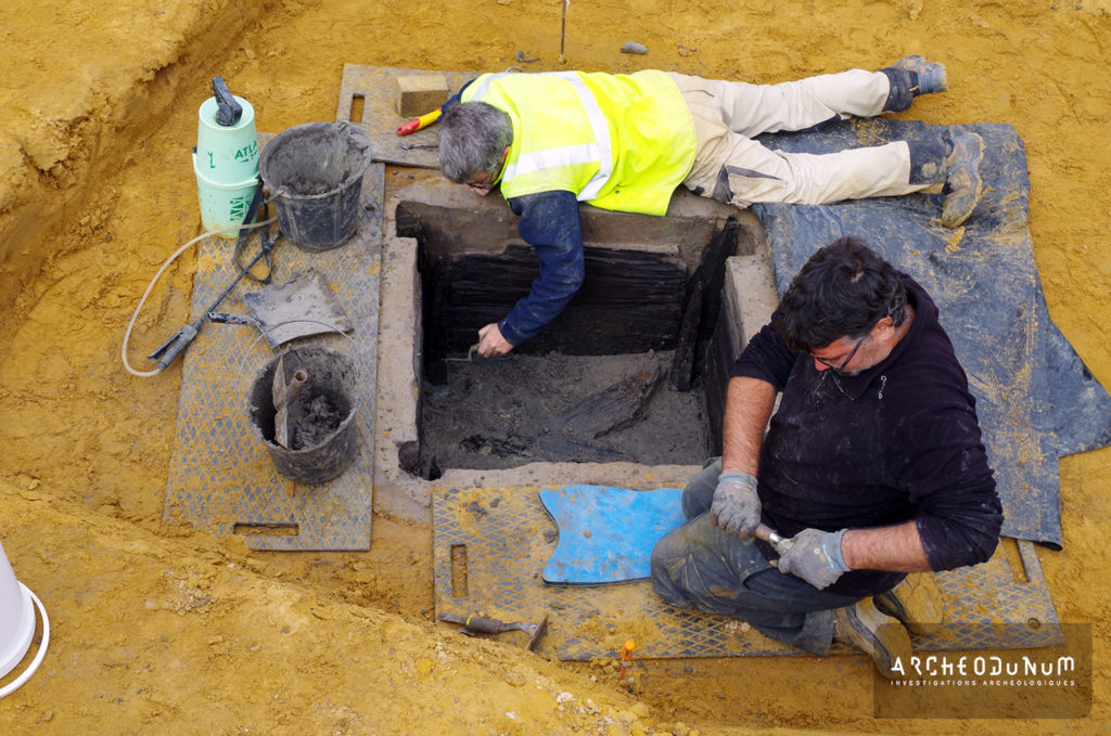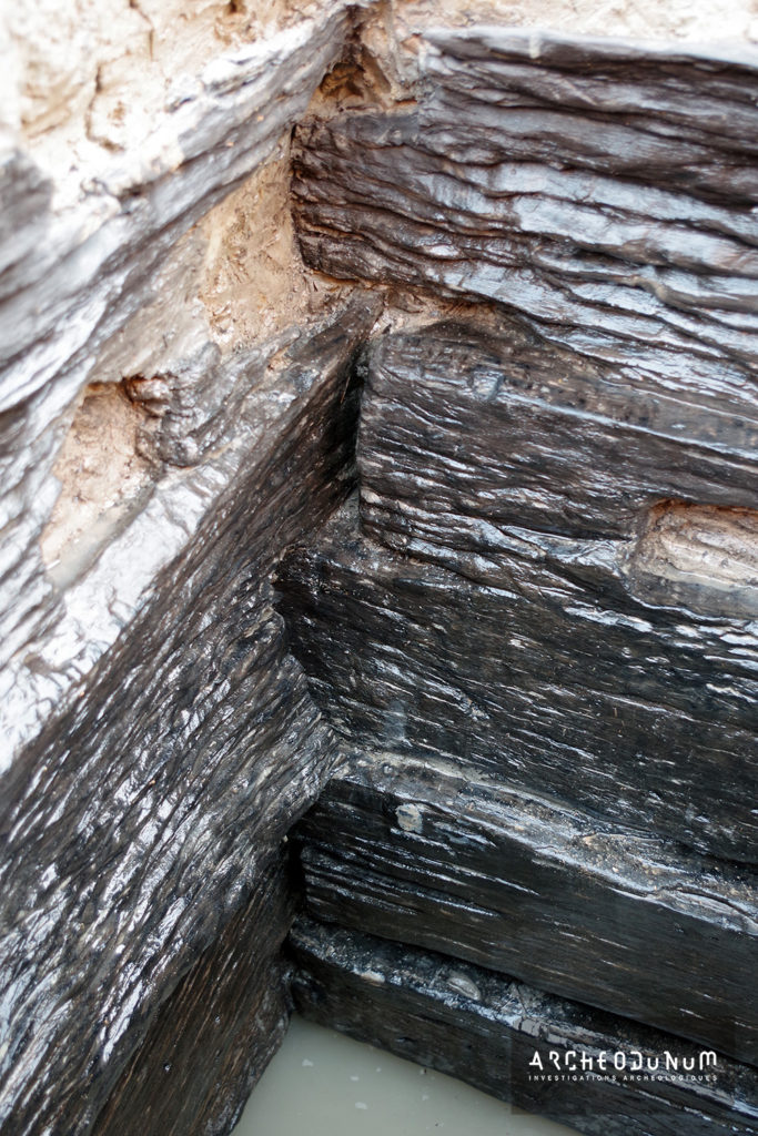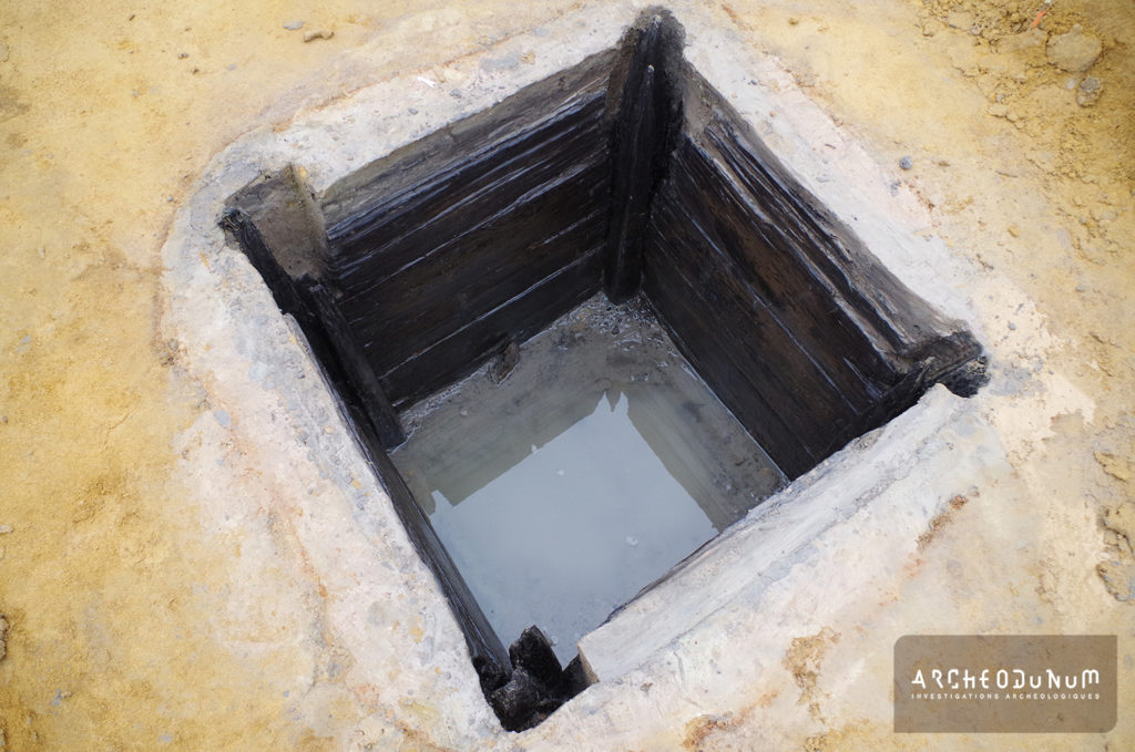 La fouille a révélé la présence exceptionnelle au sein de l’enclos gaulois de trois puits d’une profondeur moyenne de 4,50 m, parmi lesquels deux présentaient un cuvelage en bois de chêne dont la partie inférieure nous est parvenue dans un parfait état de conservation. Ces deux cuvelages, qui ont pu être intégralement démontés et prélevés, étaient ainsi conservés depuis le fond des puits sur une hauteur de près de 1,20 m. Le premier puits disposait d’un cuvelage soigné composé de quatre poteaux d’angles rainurés entre lesquels avaient été glissés des planches horizontales superposées, tandis que le cuvelage du deuxième puits était constitué de poutres emboîtées et superposées horizontalement suivant la technique du « blockbau ». Le caractère peu régulier des bois de ce dernier, de même que la présence sur certaines poutres de mortaises, d’encoches et de clous sans fonctions apparentes, suggèrent que son cuvelage a été conçu à l’aide de pièces de bois réemployées.