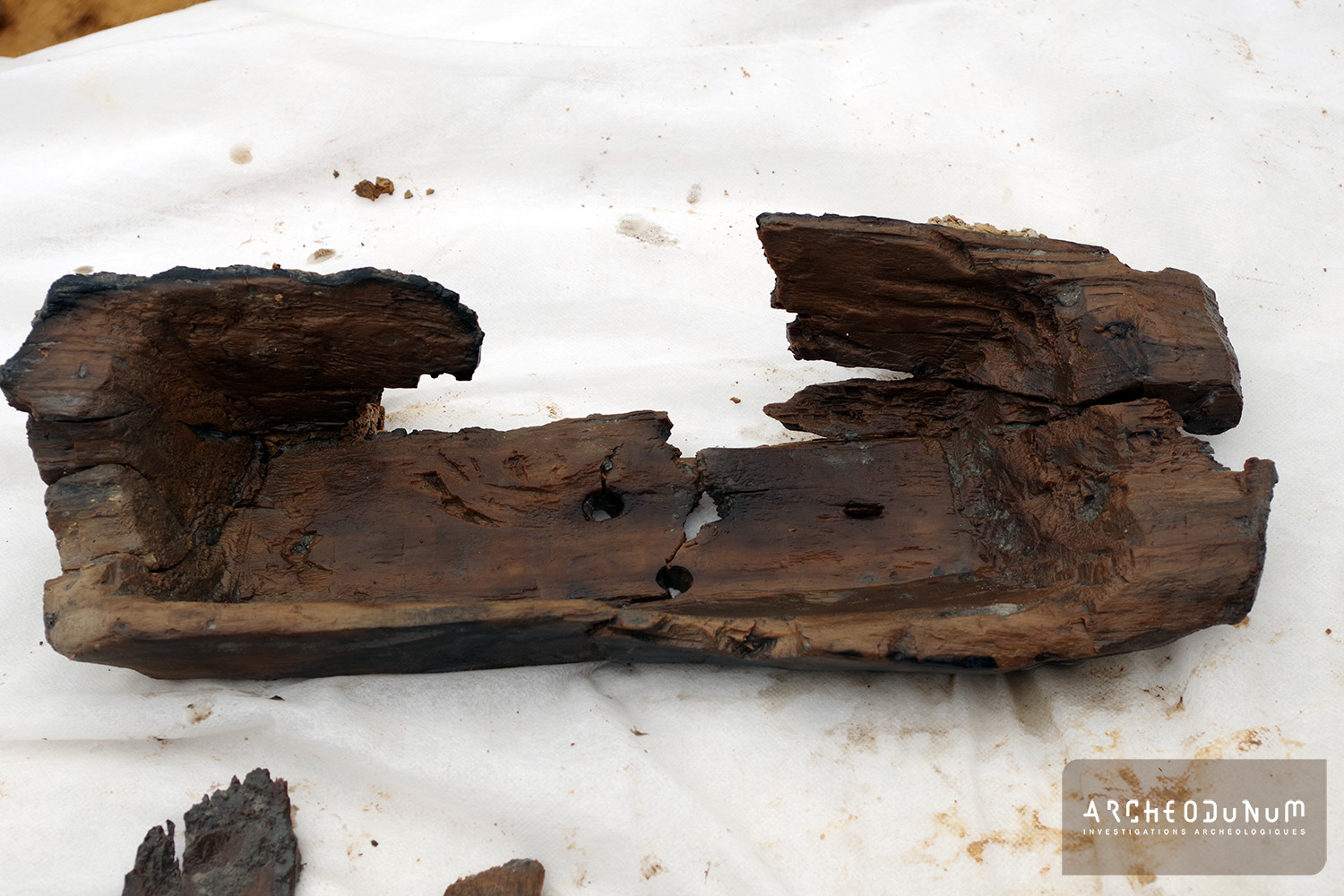 Grâce au travail des archéologues, aidés d’engins mécaniques indispensables, la fouille minutieuse de ces puits a également permis de retrouver des éléments en matières organiques piégés et conservés en milieu humide au fond des comblements. On peut mentionner la présence dans le premier puits de plusieurs fragments d’une corde et d’une attache de sceau, tandis que le deuxième puits présentait un amas spectaculaire d’éléments en bois parfois brûlés ainsi qu’une amphore et plusieurs vases écrasés. Parmi les éléments déjà identifiés se distinguent notamment une probable faisselle composée d’un demi tronc de chêne évidé et perforé, un manche de herminette (outil utilisé pour le travail du bois), ainsi que divers éléments architecturés. A ces objets s’ajoute la présence de nombreux autres restes organiques (fruits, feuilles, branchages, graines, microfaune, etc.) qui offrent de nombreuses perspectives d’analyses paléoenvironnementales pour mieux connaître le mode de vie de ces populations.